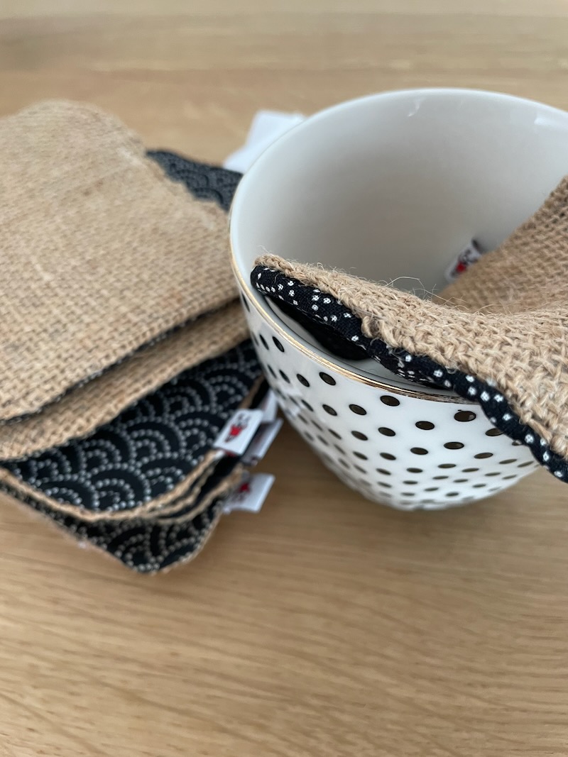 Dieses Zerowaste Schwämmli ist aus Jute, Baumwolle und Vlies genäht. Die eine Seite scheuert gut Töpfe, die baumwollige ist gut zu Gläsern.